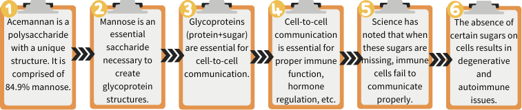 Acemannan’s unique structure binds to macrophage cell-surface receptors and activates their broad range of defense and repair functions. Macrophage are the master regulators of our immune system. No other molecule in nature or medicine has shown the capacity to function as efficiently as Acemannan in providing this benefit. *